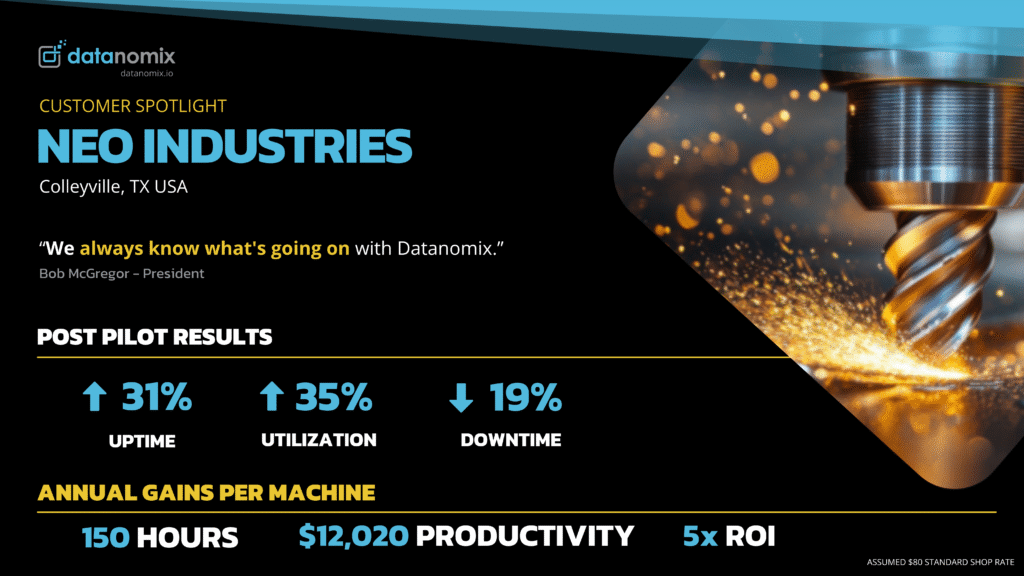 Their post-pilot results confirm what that kind of discipline produces across the operation. Neo Industries increased uptime by 25%, utilization up 35%, and downtime down 19%. Those aren’t vanity metrics. That’s the shop getting more productive output from the exact same equipment. At 150 additional productive hours per machine annually and $12,020 in productivity gains, the ROI case for Datanomix is straightforward: a 5x return.